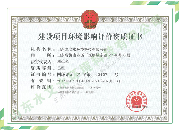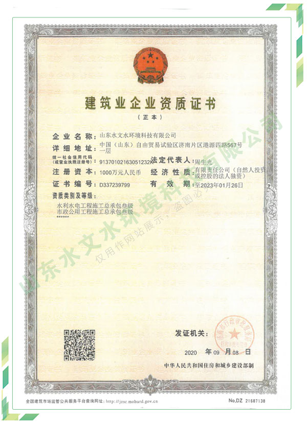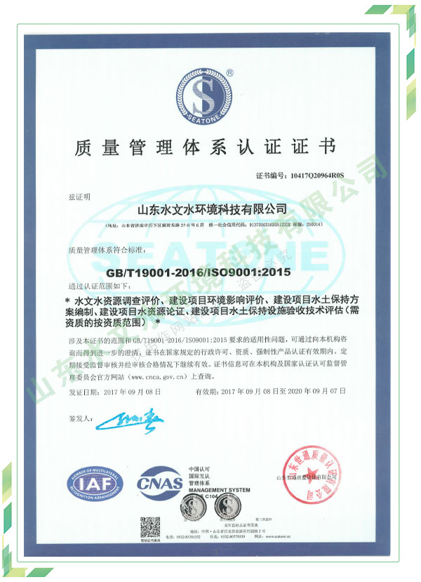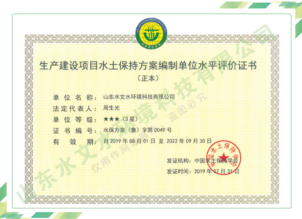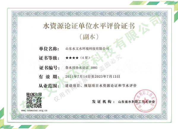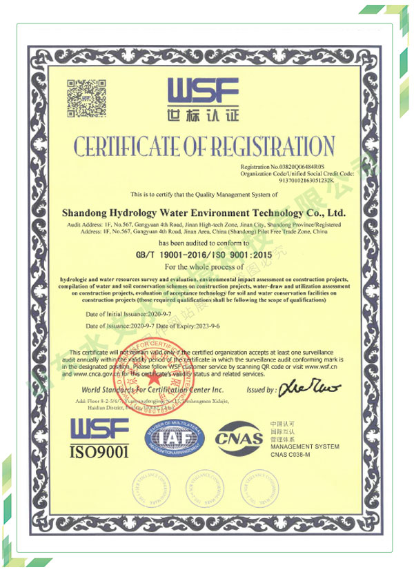 公司擁有水利工程設(shè)計、水土保持、水文水資源調(diào)查評價、水資源論證、建設(shè)項目環(huán)境影響評價、市政公用工程施工總承包、水利水電工程施工總承包、電子與智能化工程專業(yè)承包等資質(zhì),2017年通過質(zhì)量管理體系、環(huán)境管理體系、職業(yè)健康安全管理體系認(rèn)證;2020年被評為國家級高新技術(shù)企業(yè),同年被中國水利企業(yè)協(xié)會推薦為第一批“合同節(jié)水服務(wù)企業(yè)”;2021年被山東省、濟南市評為 “專精特新”中小企業(yè)。業(yè)務(wù)范圍涉及水利工程設(shè)計;節(jié)水設(shè)計、改造、水平衡測試;山洪災(zāi)害調(diào)查;城市水資源調(diào)查評價;建設(shè)項目水土保持方案編制、監(jiān)測、驗收、水土保持規(guī)劃;水安全保障規(guī)劃、建設(shè)項目水資源論證、規(guī)劃水資源論證;建設(shè)項目環(huán)境影響評價;入河排污口論證;防洪影響評價;市政公用工程施工、水利水電工程施工、電子與智能化工程施工等。